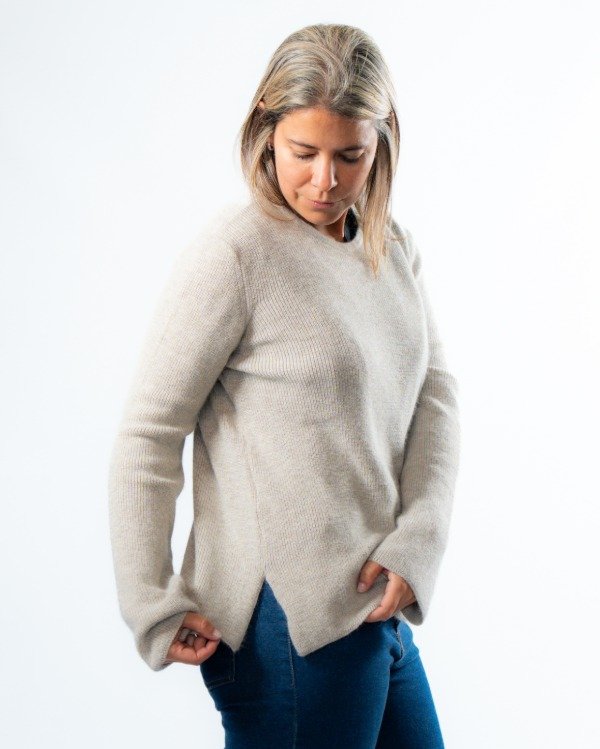 Tejido en punto Perlé de angora, tiene una caída natural y una sensación cálida al contacto con la piel. Su diseño de cuello redondo lo hace clásico y atemporal, mientras que los tajos laterales suman movimiento y comodidad.