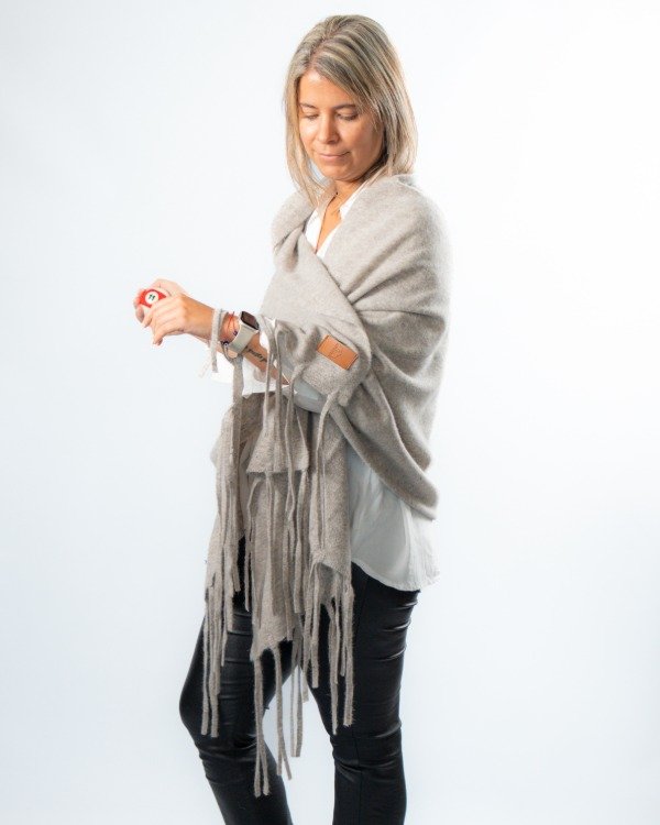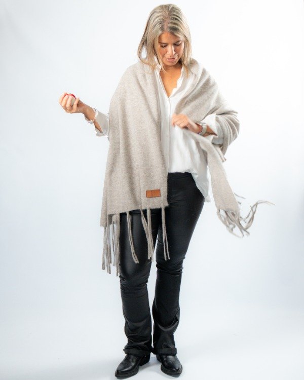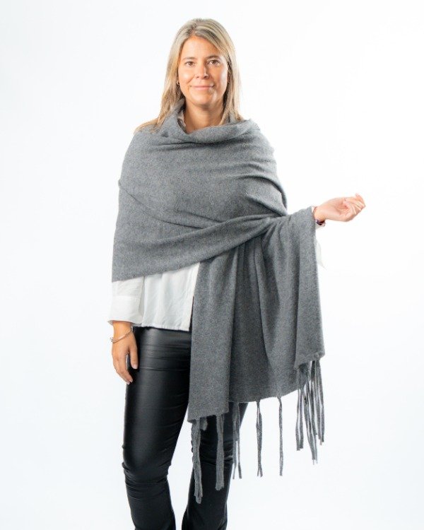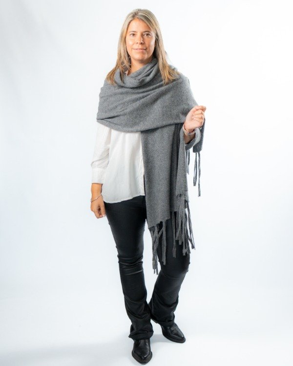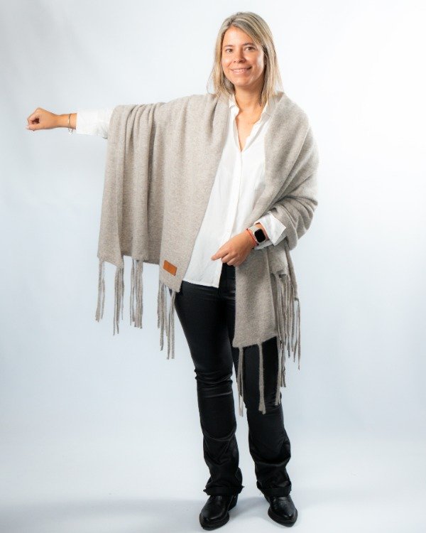 Chal con flecos tejido en lana Merino, una fibra natural reconocida por su suavidad, calidez y calidad superior.