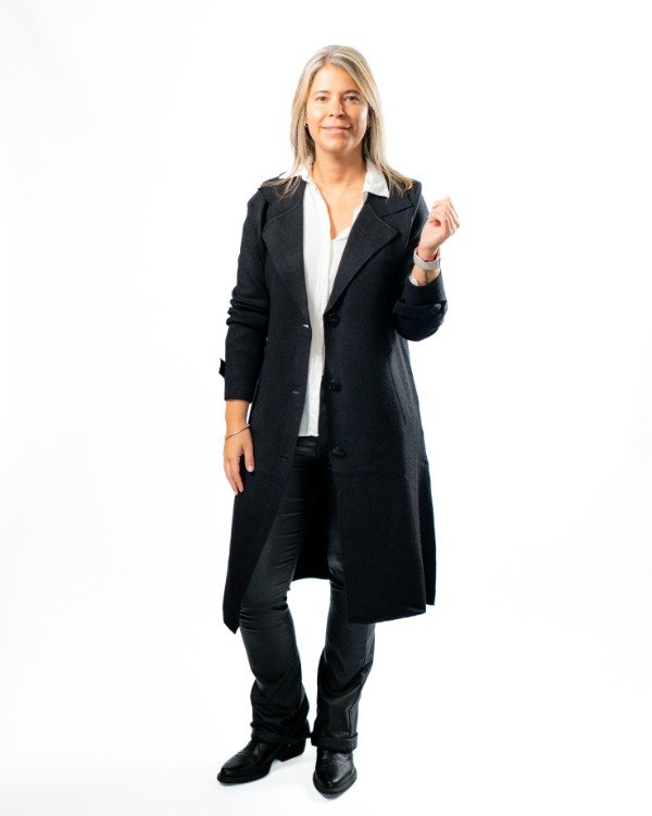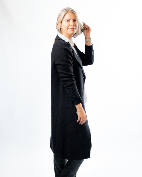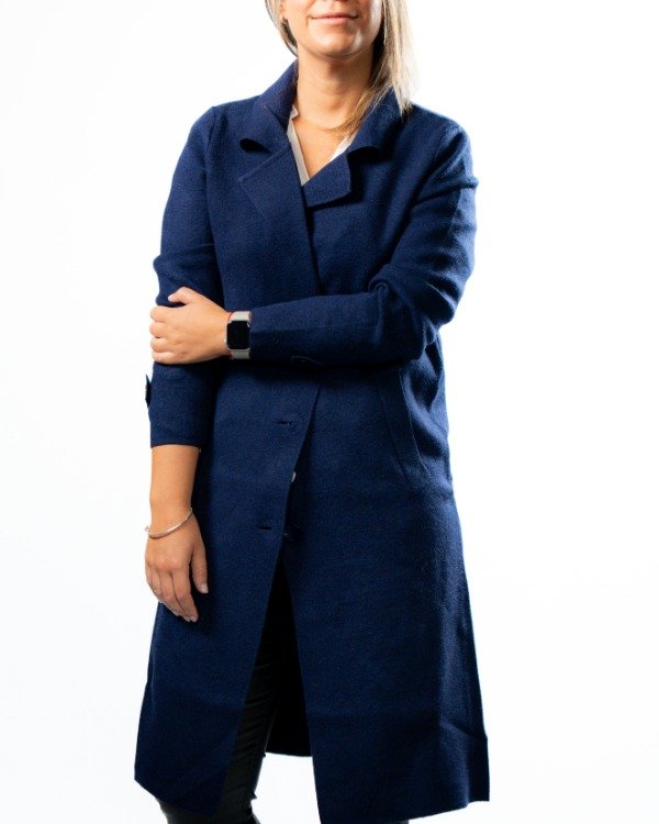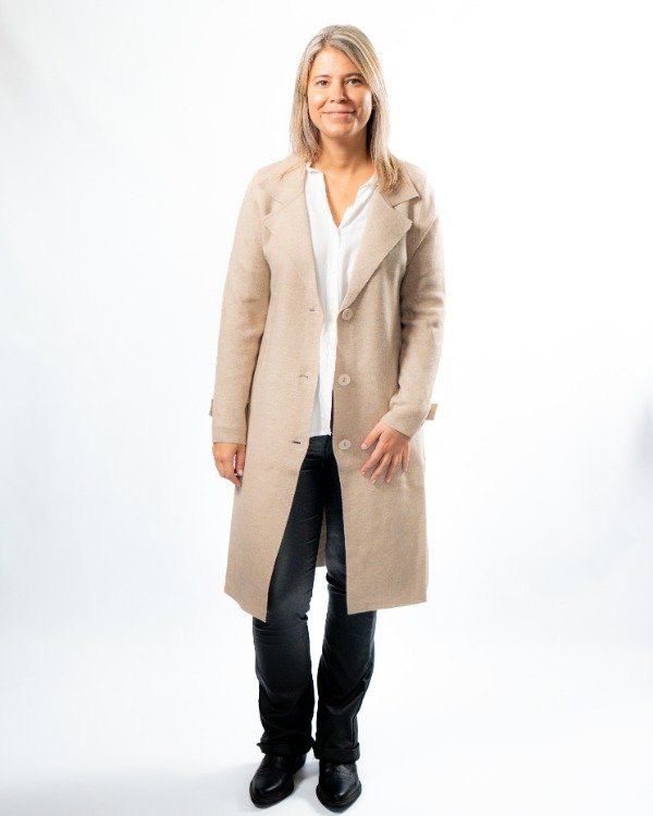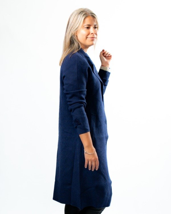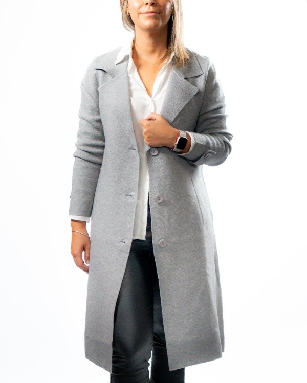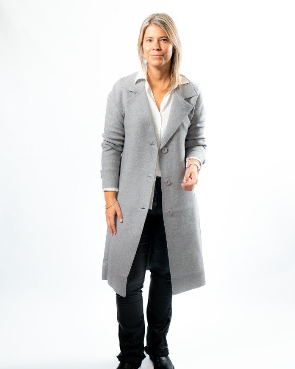 Cuenta con solapa clásica que realza el diseño, mangas con detalle de botón y martingala que le suman carácter, y tres botones al tono en el frente para un cierre delicado y armónico. En el frente, las solapas simulan bolsillos, manteniendo una estética limpia y sofisticada.